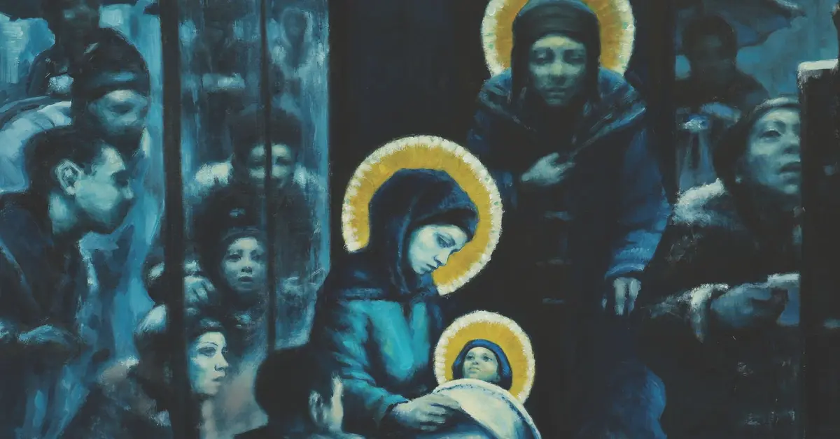 One of the things I love about Christmas is seeing how artists have depicted the Nativity scene in different times and cultures. A number of years ago, the Churches Advertising Network used a painting by Andrew Gadd in their campaign (pictured above). It shows Mary, Joseph and baby Jesus sitting at a bus stop on a busy high street. The image was placed at bus stops around the UK to make people stop and reflect. It’s not a heart-warming picture of the Nativity. In fact, it’s quite uncomfortable. It’s raining, Joseph looks freezing and passers-by are peering at them through the window. Other people ignore them, eager to catch their bus.