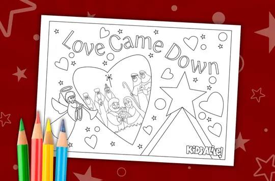 A more advanced colouring sheet from Kids Alive! that features the words ‘Love Came Down’ and a nativity scene.