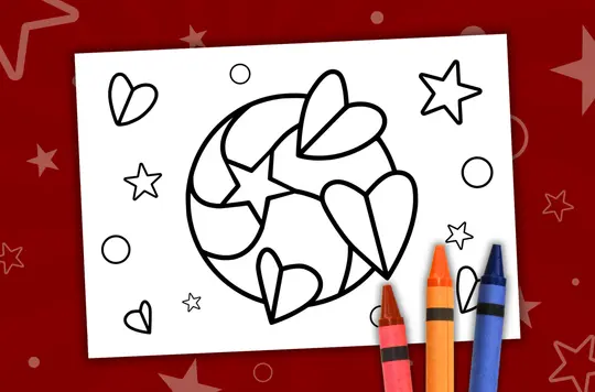 A simple colouring sheet that features the Love Came Down logo, stars, circles and hearts.